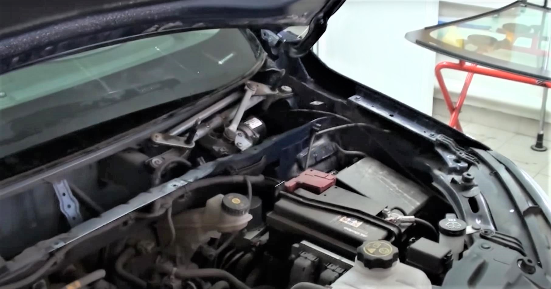 - Открыв капот, снимаем стеклоочистители (откручиваем гайку и спрессовываем рычаги дворников) и решетку короба воздухозаборника (выкрутив все винты);